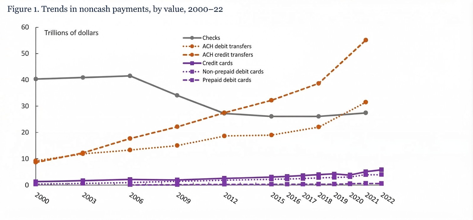 According to the Federal Reserve Payments Study, the digital payment infrastructure is now the primary foundation of the U.S. financial system, from 2000 to 2022, both the value and number of non-cash transactions increased significantly, reflecting a structural shift away from paper-based payments toward digital payment systems.